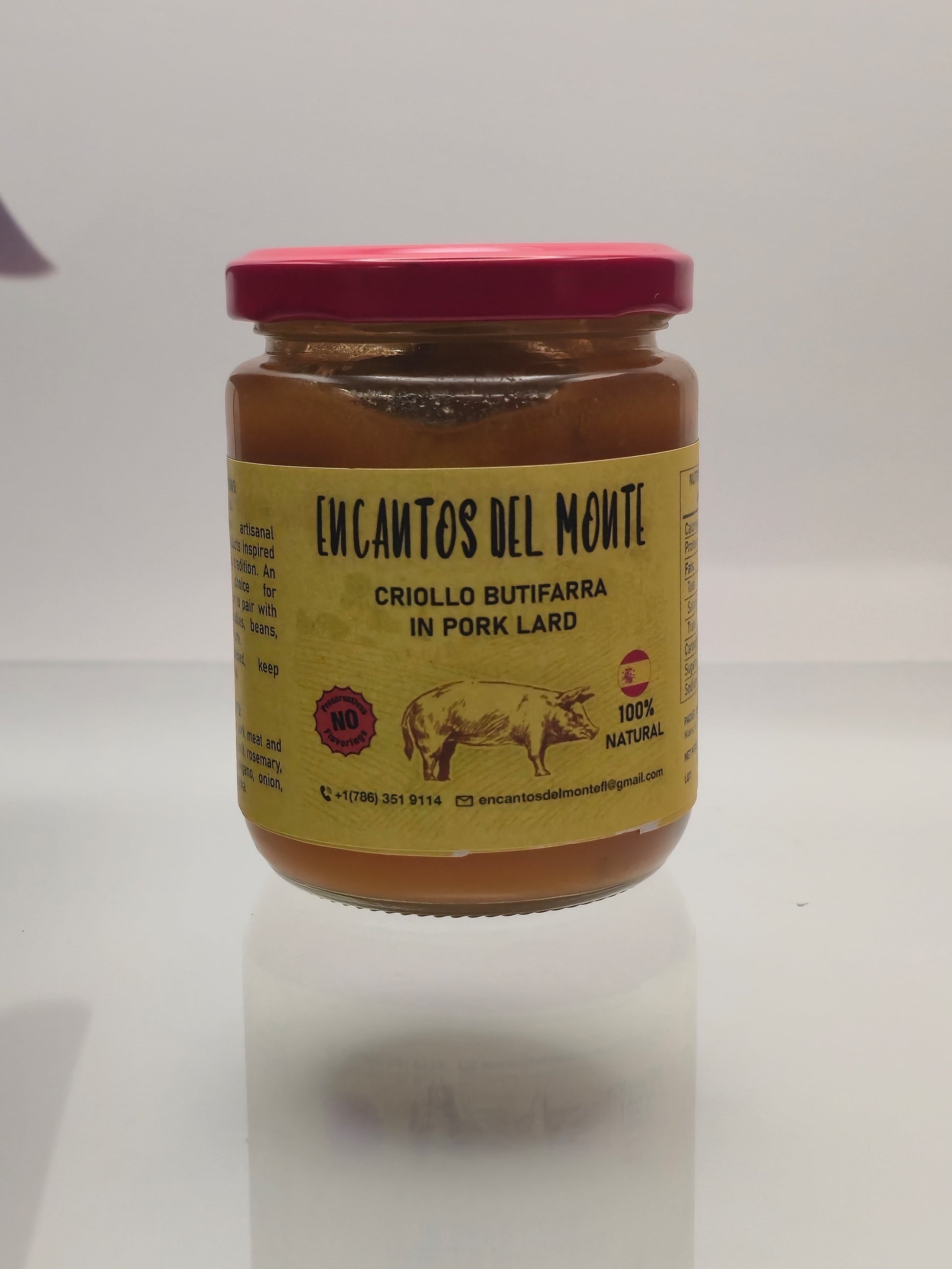 Preparation: Slowly cooked in pork lard, in the Spanish style, with an authentic, intense and natural Creole flavor, with a rustic touch that makes it unique and original. With natural preservatives such as rosemary, bay leaf, oregano, paprika, pepper, onion, garlic, and salt.