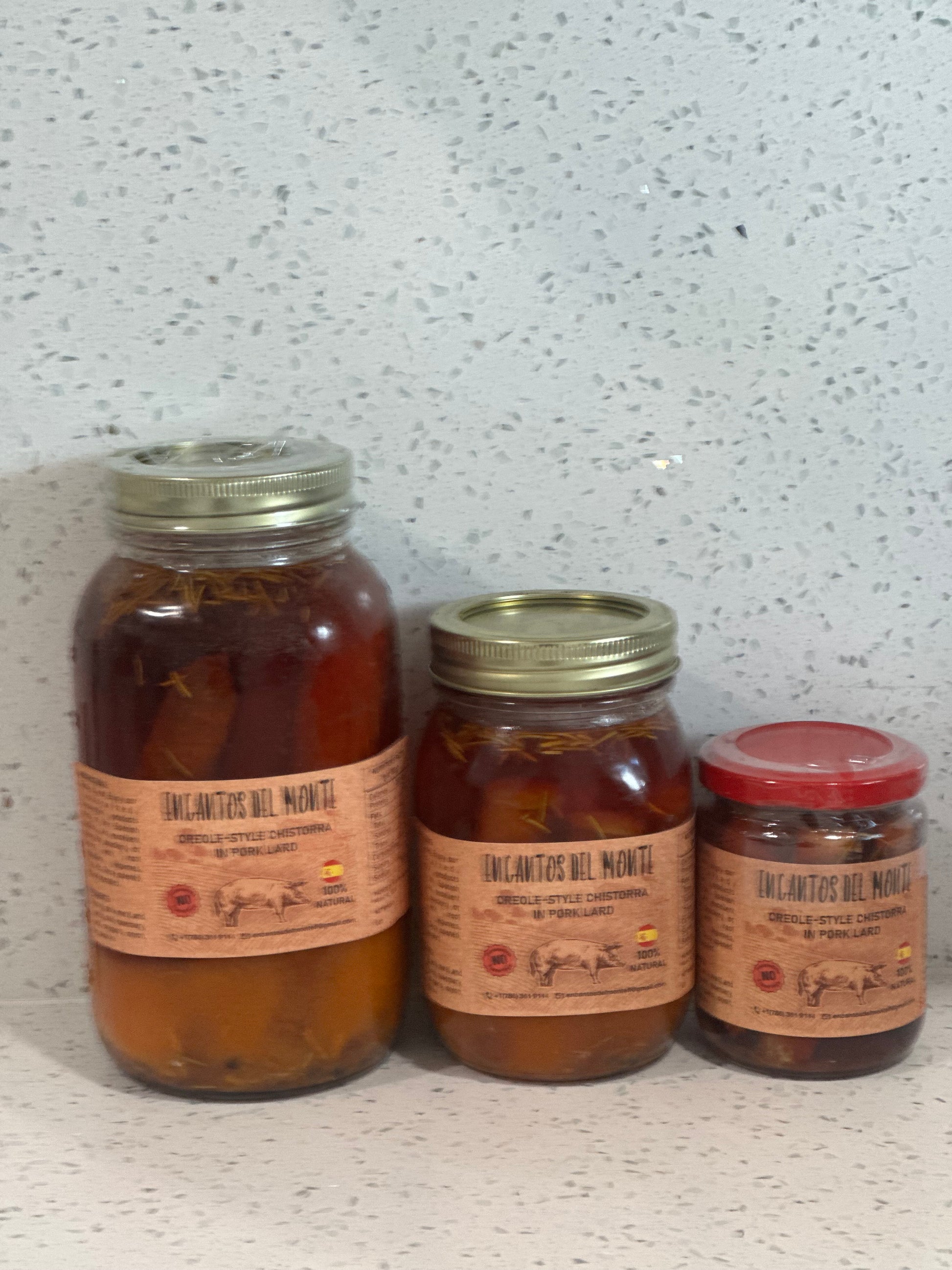 Elaboración: Cocido lentamente en manteca de cerdo, al estilo español, sabor criollo autentico, intenso y natural, con el toque campestre que lo hace único y original. Con conservantes naturales como, Romero, Laurel, Orégano, Pimentón, Pimienta, Cebolla, Ajo, Sal.